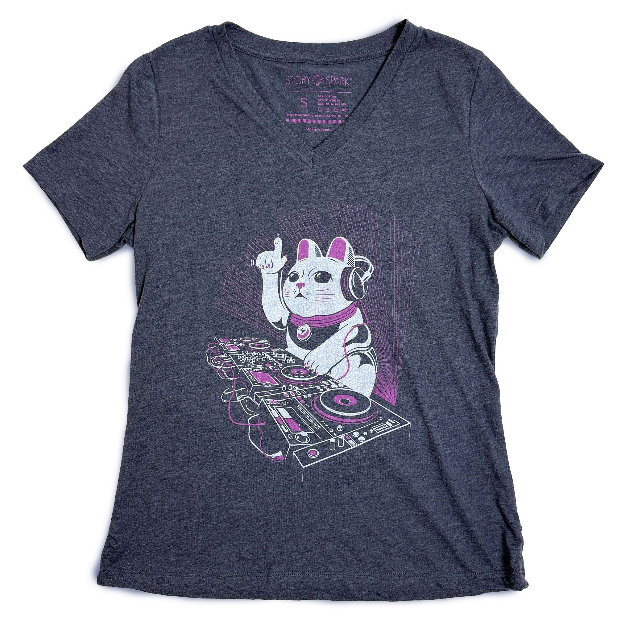 At STORY SPARK, we take great pride in creating unique illustrations on soft, lightweight graphic tees that allow you to tell a story and spark connections wherever you go. Make this music-loving Maneki Neko women's v-neck tee part of your story, and see what conversations you can inspire.