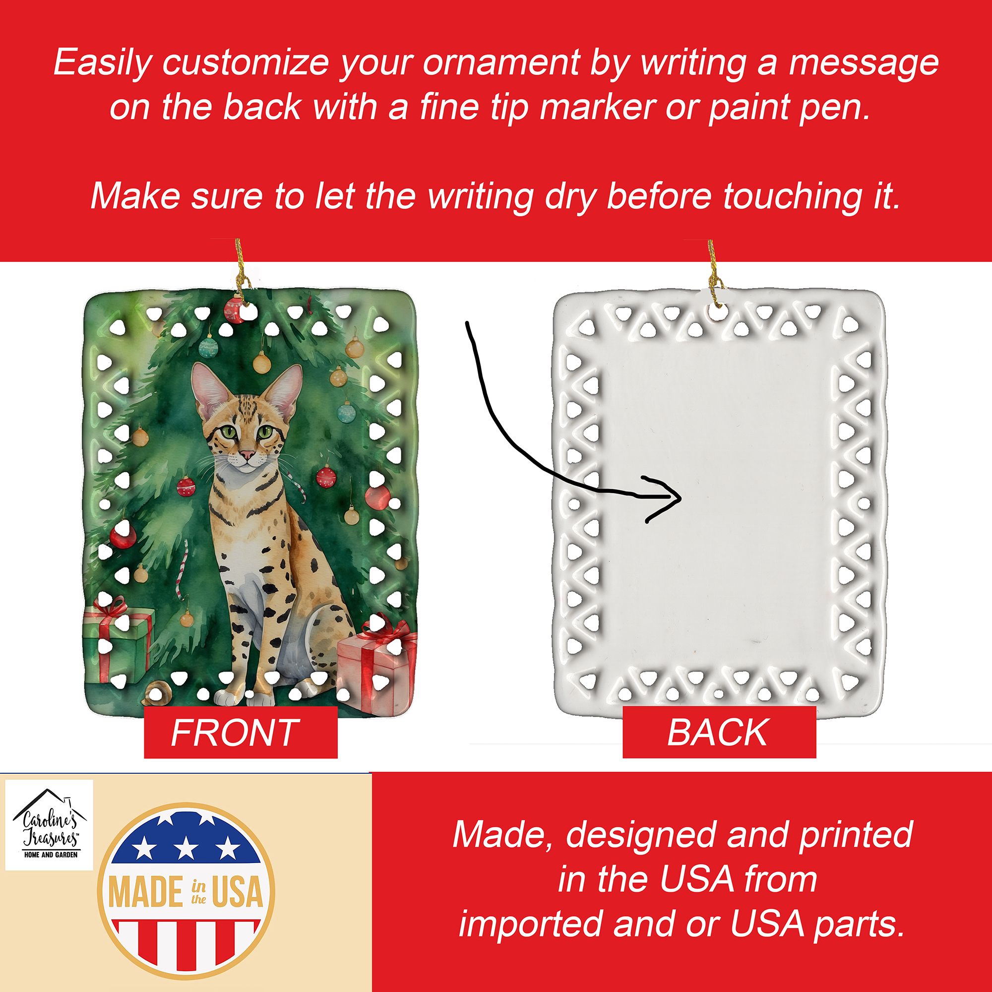 Porcelain Ornament featuring breed specific Savannah artwork. Celebrate Christmas with this Christmas Ornament. Add a unique, personal touch to your holiday decor with our Rectangular Lattice Porcelain Ornament. Perfect for creating cherished memories, this high-quality ornament shines under festive lights, reflecting warmth and joy throughout your Christmas tree. Crafted with a glossy finish, it showcases vibrant, full-color artwork contributed by our talented artists, ensuring your tree is adorned with a burst of color and holiday spirit. What sets this Porcelain Ornament apart is its customizable white back. Use a paint pen or permanent marker to write a heartfelt message, commemorate a special year, or mark an unforgettable date, turning this ornament into a keepsake that will be treasured for years to come. For best results, allow any personalization to dry thoroughly before handling. Each ornament comes complete with a delicate gold cord, making it easy to hang and display. Proudly made in the USA, this ornament measures 3.375 x 2.625 inches and is a thoughtful gift for pet sitters, teachers, family members, or anyone who would appreciate a little extra holiday magic. Bring style, charm, and a touch of personal meaning to your Christmas tree with this beautifully designed ornament..