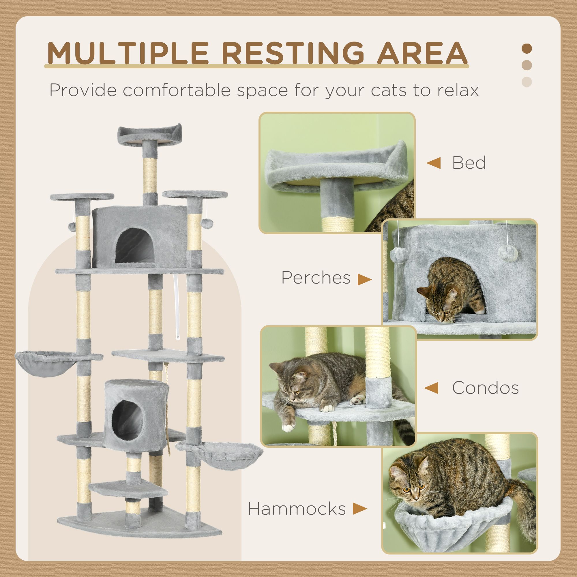Cats enjoy jumping, running, hiding, scratching and hanging out, which keeps them healthy and happy. A suitable cat tree is just such a place for cats to do these activities. With this tall cat tree from PawHut, rest and play in a spot. Features scratching posts, condos, hammocks, beds, perches and cat toys. The sisal-wrapped posts keep claws sharp and away from the furniture. Using particle board for a robust structure, it's covered in plush so it's soft and cozy for your pet.