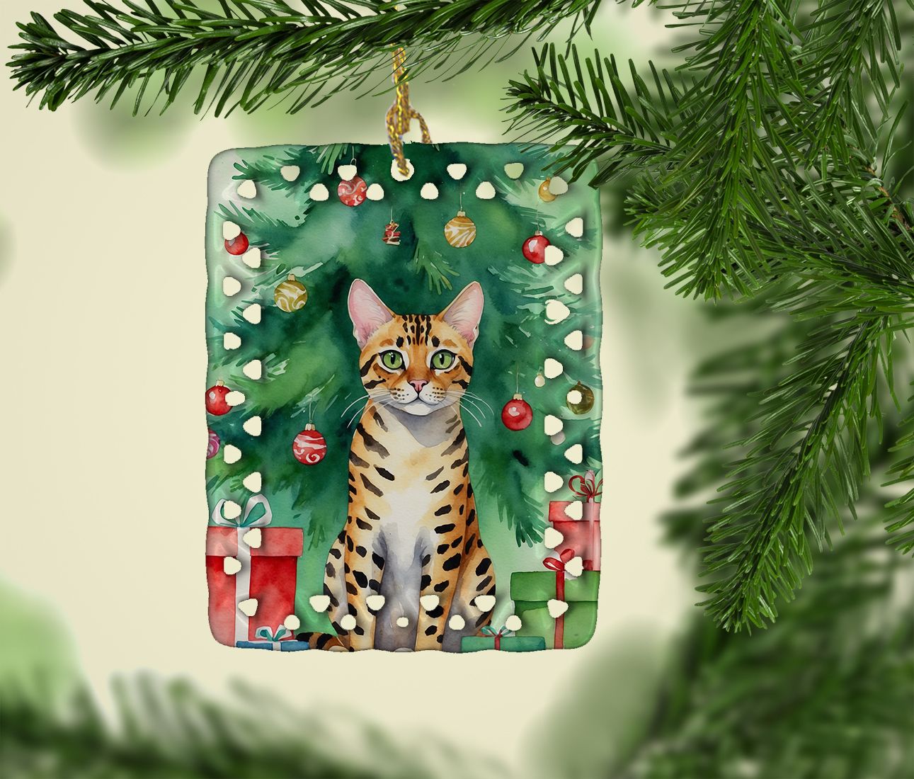 Porcelain Ornament featuring breed specific Bengal Cat artwork. Celebrate Christmas with this Christmas Ornament. Add a unique, personal touch to your holiday decor with our Rectangular Lattice Porcelain Ornament. Perfect for creating cherished memories, this high-quality ornament shines under festive lights, reflecting warmth and joy throughout your Christmas tree. Crafted with a glossy finish, it showcases vibrant, full-color artwork contributed by our talented artists, ensuring your tree is adorned with a burst of color and holiday spirit. What sets this Porcelain Ornament apart is its customizable white back. Use a paint pen or permanent marker to write a heartfelt message, commemorate a special year, or mark an unforgettable date, turning this ornament into a keepsake that will be treasured for years to come. For best results, allow any personalization to dry thoroughly before handling. Each ornament comes complete with a delicate gold cord, making it easy to hang and display. Proudly made in the USA, this ornament measures 3.375 x 2.625 inches and is a thoughtful gift for pet sitters, teachers, family members, or anyone who would appreciate a little extra holiday magic. Bring style, charm, and a touch of personal meaning to your Christmas tree with this beautifully designed ornament..