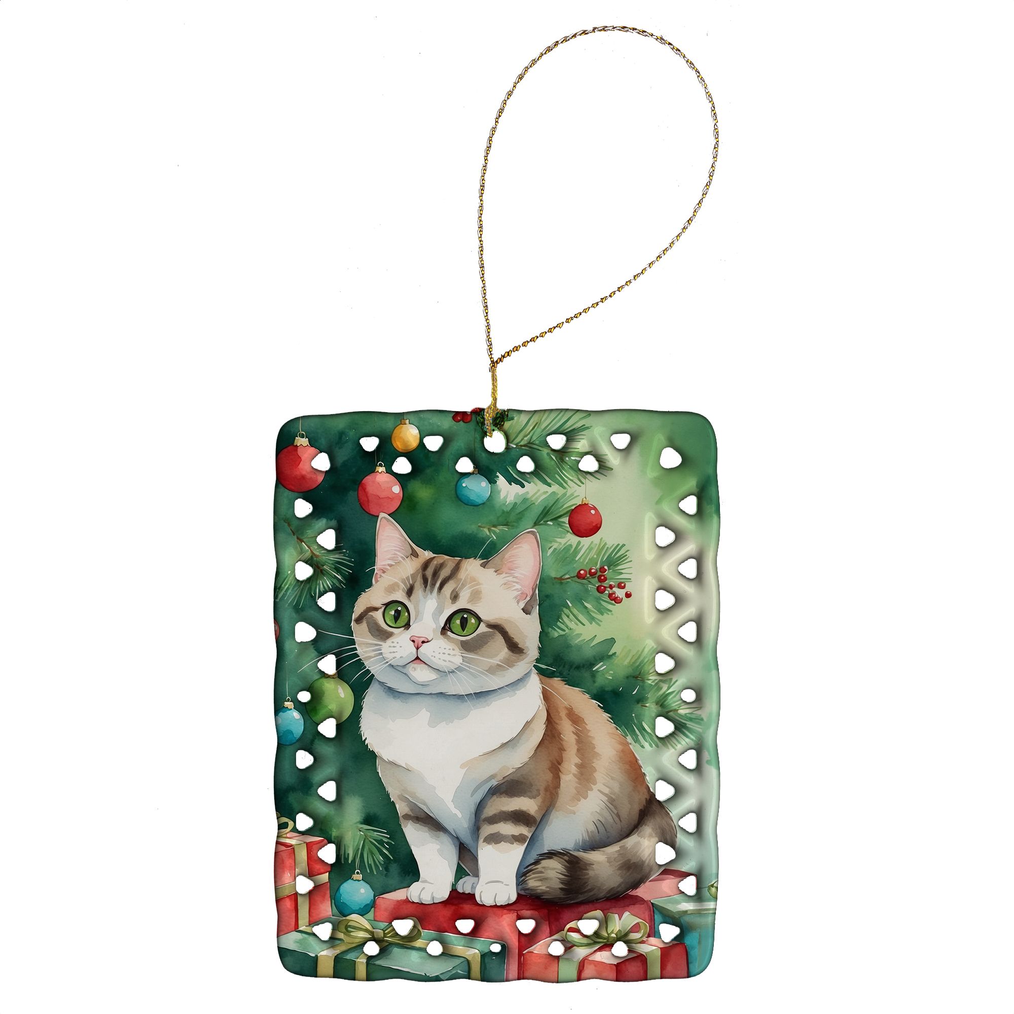 Porcelain Ornament featuring breed specific Munchkin artwork. Celebrate Christmas with this Christmas Ornament. Add a unique, personal touch to your holiday decor with our Rectangular Lattice Porcelain Ornament. Perfect for creating cherished memories, this high-quality ornament shines under festive lights, reflecting warmth and joy throughout your Christmas tree. Crafted with a glossy finish, it showcases vibrant, full-color artwork contributed by our talented artists, ensuring your tree is adorned with a burst of color and holiday spirit. What sets this Porcelain Ornament apart is its customizable white back. Use a paint pen or permanent marker to write a heartfelt message, commemorate a special year, or mark an unforgettable date, turning this ornament into a keepsake that will be treasured for years to come. For best results, allow any personalization to dry thoroughly before handling. Each ornament comes complete with a delicate gold cord, making it easy to hang and display. Proudly made in the USA, this ornament measures 3.375 x 2.625 inches and is a thoughtful gift for pet sitters, teachers, family members, or anyone who would appreciate a little extra holiday magic. Bring style, charm, and a touch of personal meaning to your Christmas tree with this beautifully designed ornament..