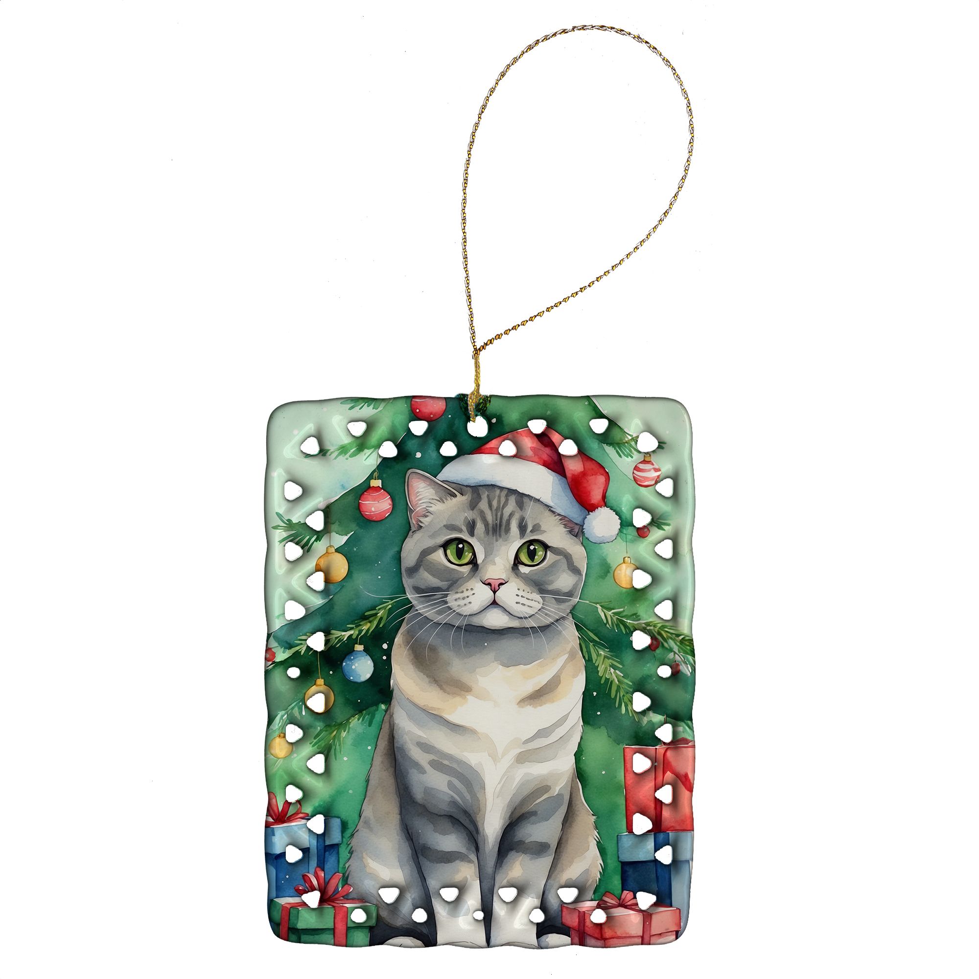 Porcelain Ornament featuring breed specific Scottish Fold artwork. Celebrate Christmas with this Christmas Ornament. Add a unique, personal touch to your holiday decor with our Rectangular Lattice Porcelain Ornament. Perfect for creating cherished memories, this high-quality ornament shines under festive lights, reflecting warmth and joy throughout your Christmas tree. Crafted with a glossy finish, it showcases vibrant, full-color artwork contributed by our talented artists, ensuring your tree is adorned with a burst of color and holiday spirit. What sets this Porcelain Ornament apart is its customizable white back. Use a paint pen or permanent marker to write a heartfelt message, commemorate a special year, or mark an unforgettable date, turning this ornament into a keepsake that will be treasured for years to come. For best results, allow any personalization to dry thoroughly before handling. Each ornament comes complete with a delicate gold cord, making it easy to hang and display. Proudly made in the USA, this ornament measures 3.375 x 2.625 inches and is a thoughtful gift for pet sitters, teachers, family members, or anyone who would appreciate a little extra holiday magic. Bring style, charm, and a touch of personal meaning to your Christmas tree with this beautifully designed ornament..