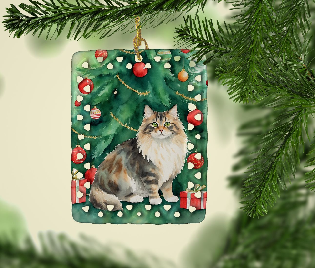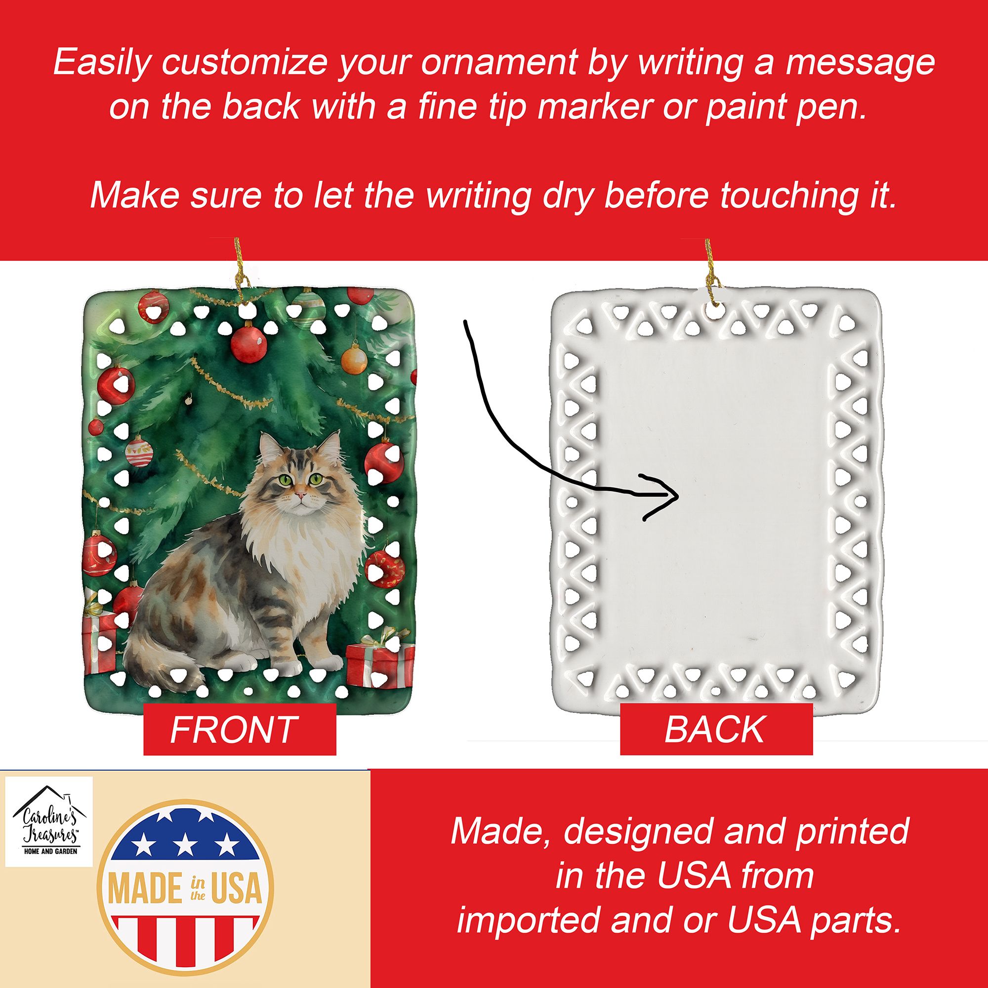 Porcelain Ornament featuring breed specific Cymric artwork. Celebrate Christmas with this Christmas Ornament. Add a unique, personal touch to your holiday decor with our Rectangular Lattice Porcelain Ornament. Perfect for creating cherished memories, this high-quality ornament shines under festive lights, reflecting warmth and joy throughout your Christmas tree. Crafted with a glossy finish, it showcases vibrant, full-color artwork contributed by our talented artists, ensuring your tree is adorned with a burst of color and holiday spirit. What sets this Porcelain Ornament apart is its customizable white back. Use a paint pen or permanent marker to write a heartfelt message, commemorate a special year, or mark an unforgettable date, turning this ornament into a keepsake that will be treasured for years to come. For best results, allow any personalization to dry thoroughly before handling. Each ornament comes complete with a delicate gold cord, making it easy to hang and display. Proudly made in the USA, this ornament measures 3.375 x 2.625 inches and is a thoughtful gift for pet sitters, teachers, family members, or anyone who would appreciate a little extra holiday magic. Bring style, charm, and a touch of personal meaning to your Christmas tree with this beautifully designed ornament..