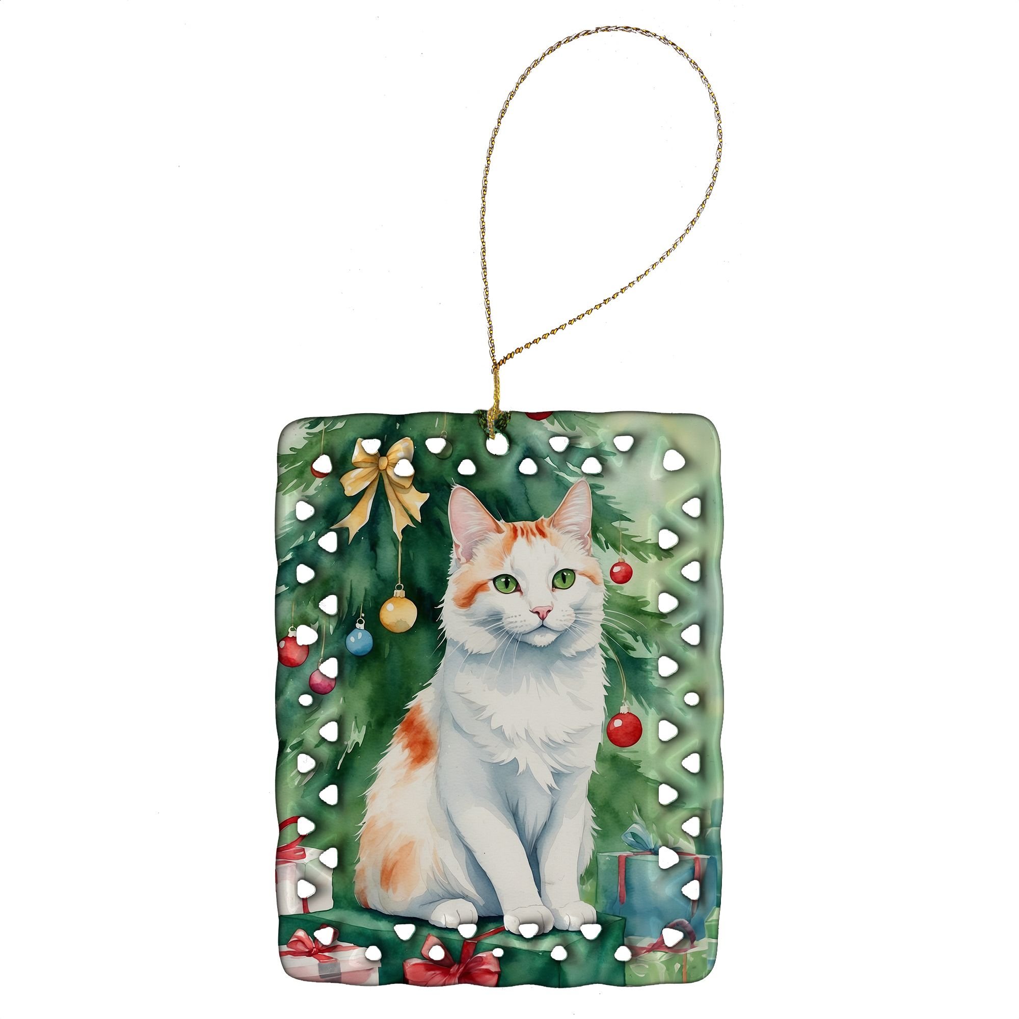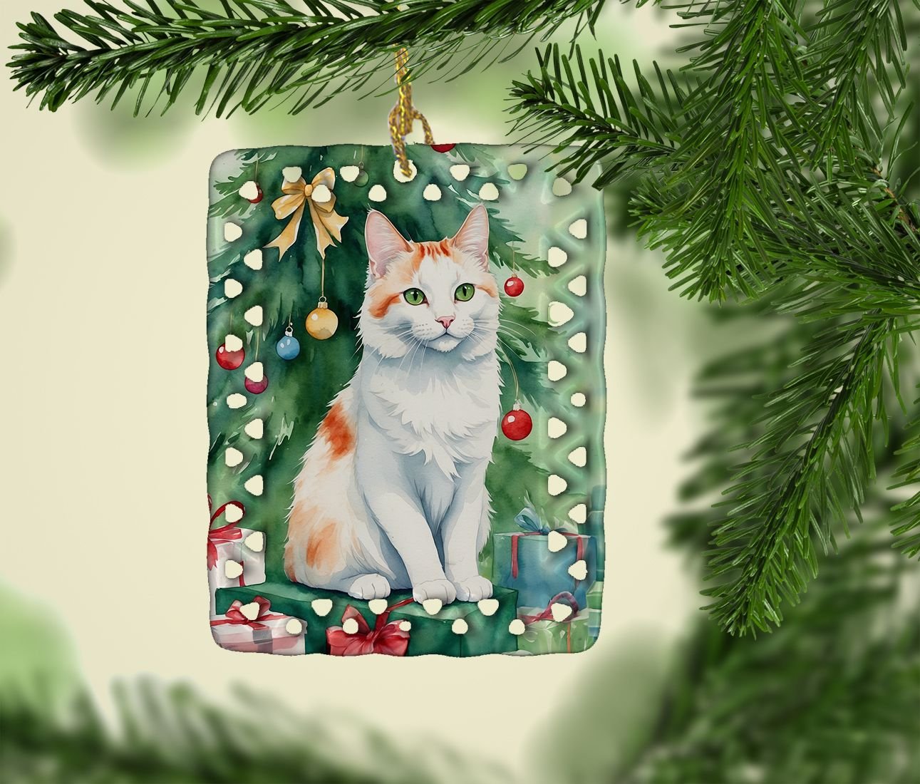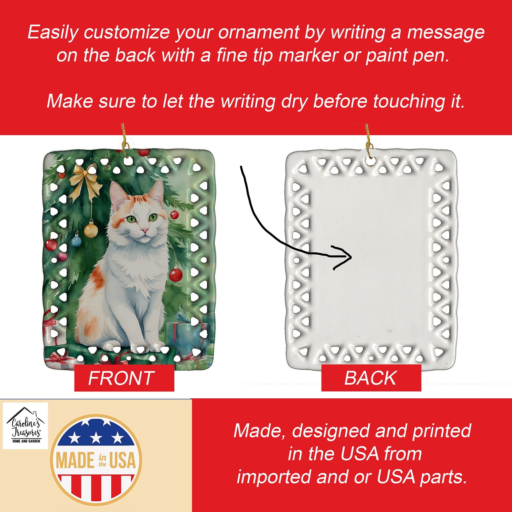 Porcelain Ornament featuring breed specific Turkish Van artwork. Celebrate Christmas with this Christmas Ornament. Add a unique, personal touch to your holiday decor with our Rectangular Lattice Porcelain Ornament. Perfect for creating cherished memories, this high-quality ornament shines under festive lights, reflecting warmth and joy throughout your Christmas tree. Crafted with a glossy finish, it showcases vibrant, full-color artwork contributed by our talented artists, ensuring your tree is adorned with a burst of color and holiday spirit. What sets this Porcelain Ornament apart is its customizable white back. Use a paint pen or permanent marker to write a heartfelt message, commemorate a special year, or mark an unforgettable date, turning this ornament into a keepsake that will be treasured for years to come. For best results, allow any personalization to dry thoroughly before handling. Each ornament comes complete with a delicate gold cord, making it easy to hang and display. Proudly made in the USA, this ornament measures 3.375 x 2.625 inches and is a thoughtful gift for pet sitters, teachers, family members, or anyone who would appreciate a little extra holiday magic. Bring style, charm, and a touch of personal meaning to your Christmas tree with this beautifully designed ornament..